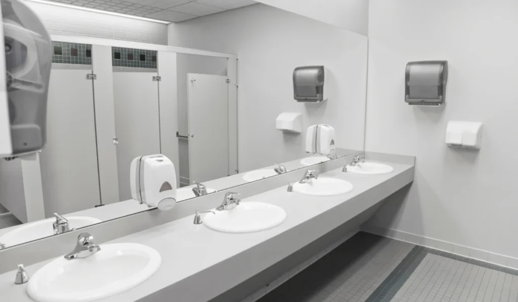Full sanitization of toilets, sinks, mirrors, and partitions